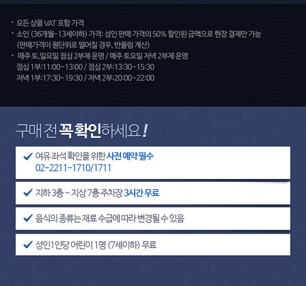 주중/주말 저녁 1부 오후 5시 30분 – 오후 7시 30분, 2부 오후 8시 – 오후 10시