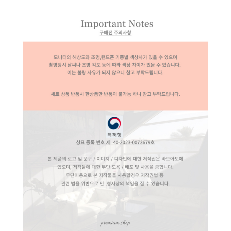 - ㆍ모니터 해상도의 차이로 인해 색상이나 이미지가 실제와 달라, 고객이 단순 변심으로 교환/반품을 무료로 요청하는 경우