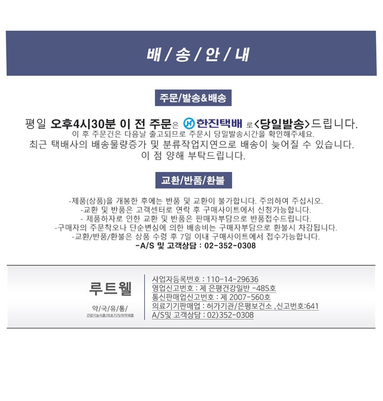 | 교환/반품 신청 기준일 | ㆍ단순변심에 의한 교환/반품은 제품 수령 후 7일 이내까지, 교환/반품 제한사항에 해당하지 않는 경우에만 가능 (배송비용과 교환/반품 비용 왕복배송비 고객부담) ㆍ상품의 내용이 표시·광고의 내용과 다른 경우에는 상품을 수령한 날부터 3개월 이내, 그 사실을 안 날 또는 알 수 있었던 날부터 |