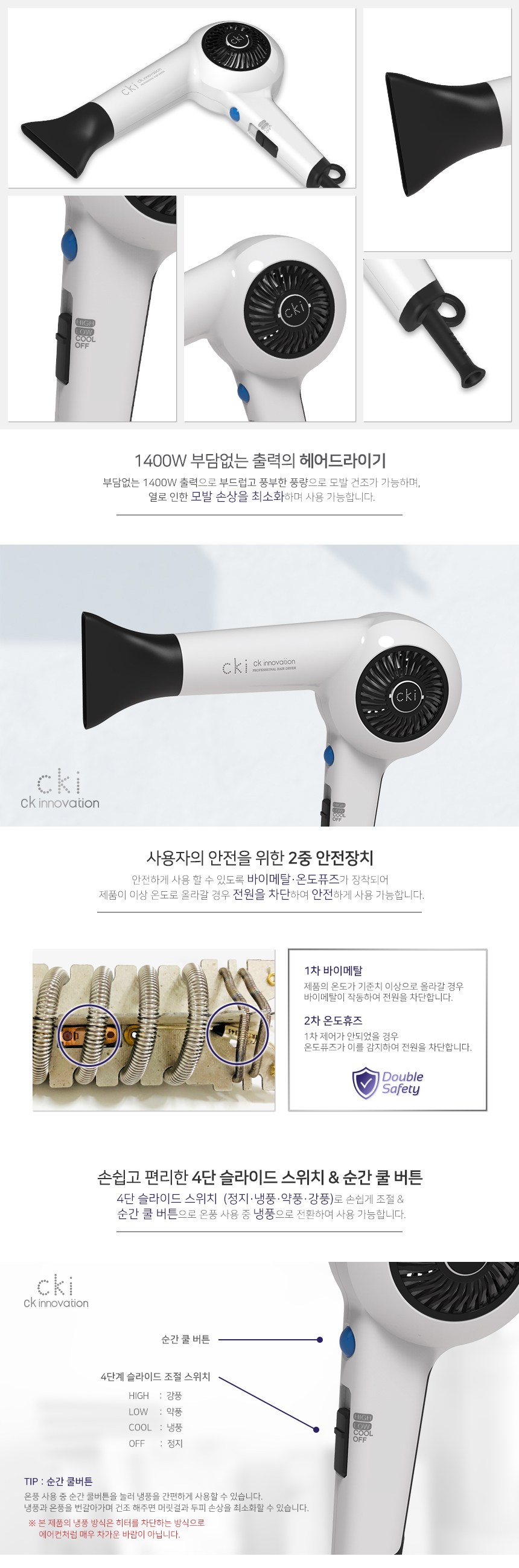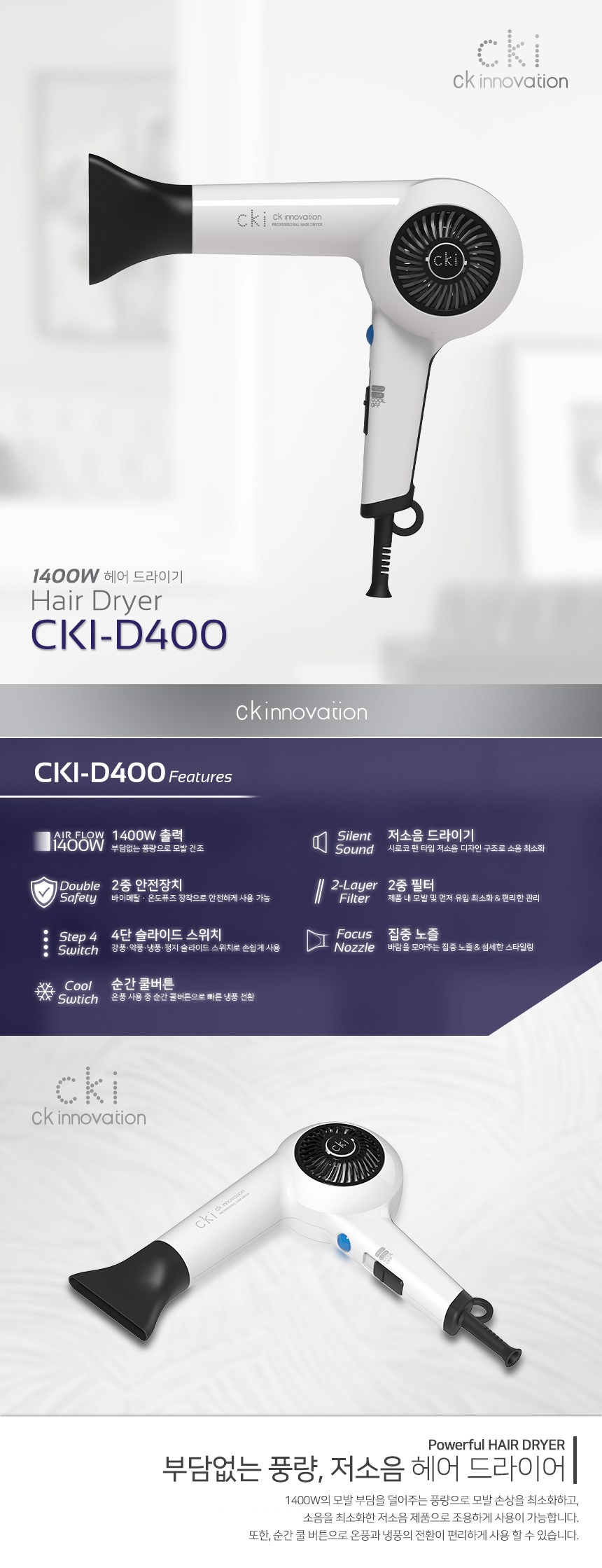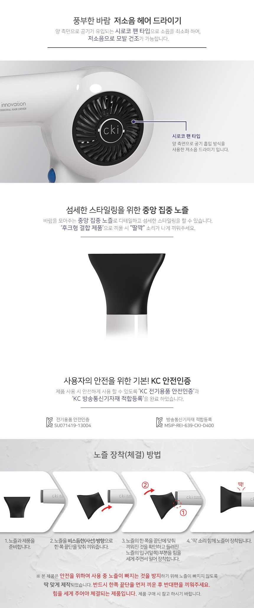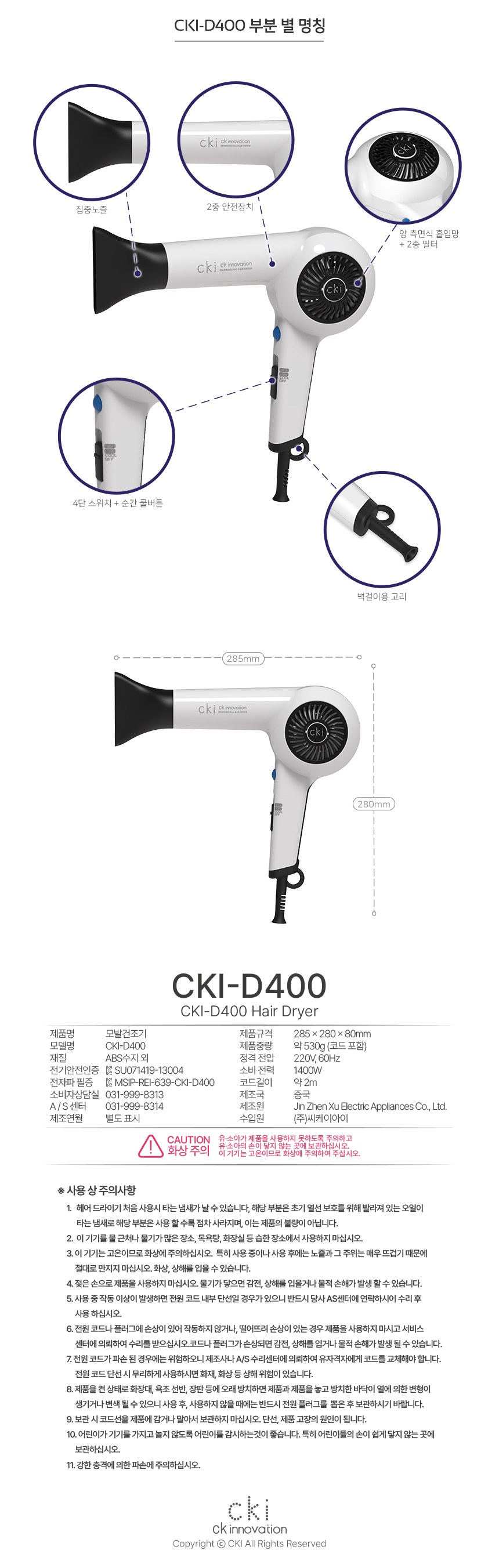 | 품명 및 모델명 | 모발건조기/ CKI-D400 | KC 인증정보 | SU071419-13004 , MSIP-REI-639-CKI-D400 |
