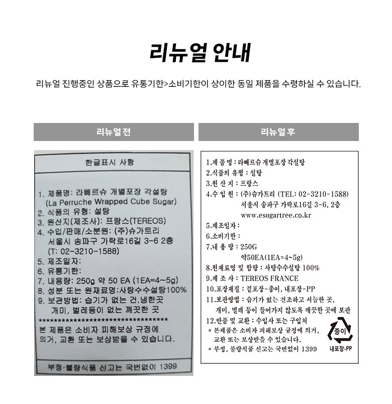 | 제품명 | 라빼르슈 개별포장 각설탕 | 식품의 유형 | 설탕 |