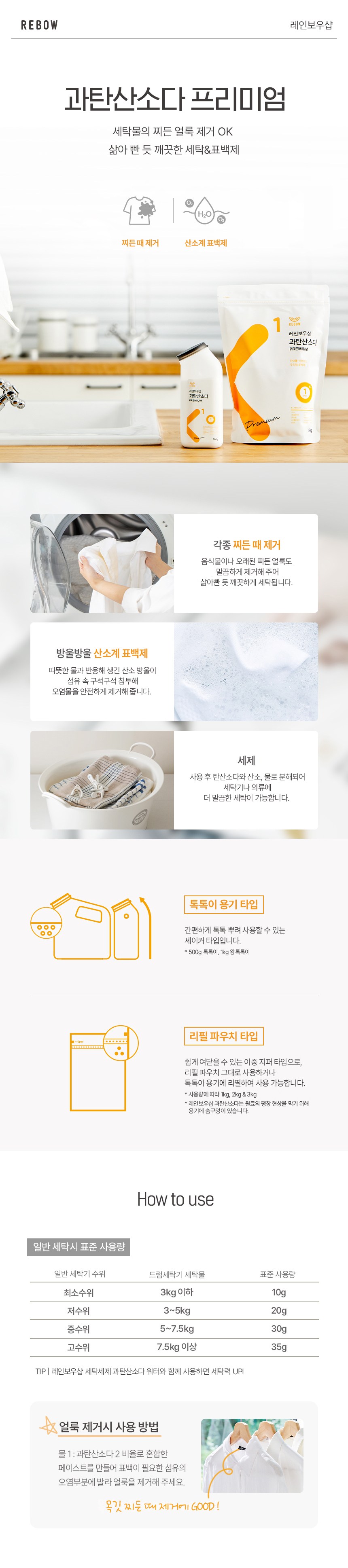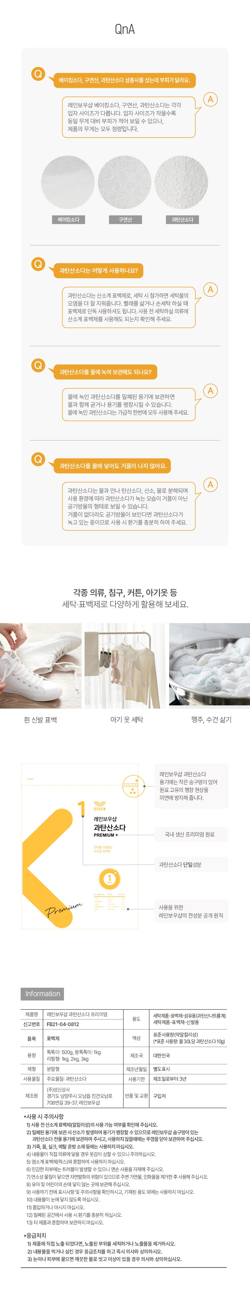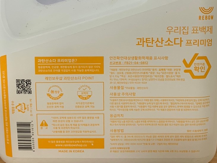 | 품목 및 제품명 | 표백제 / 레인보우샵 과탄산소다 프리미엄 | 용도(표백제의 경우 계열을 함께표시) 및 제형 | 섬유용, 신발용(과탄산나트륨계) / 분말형 |