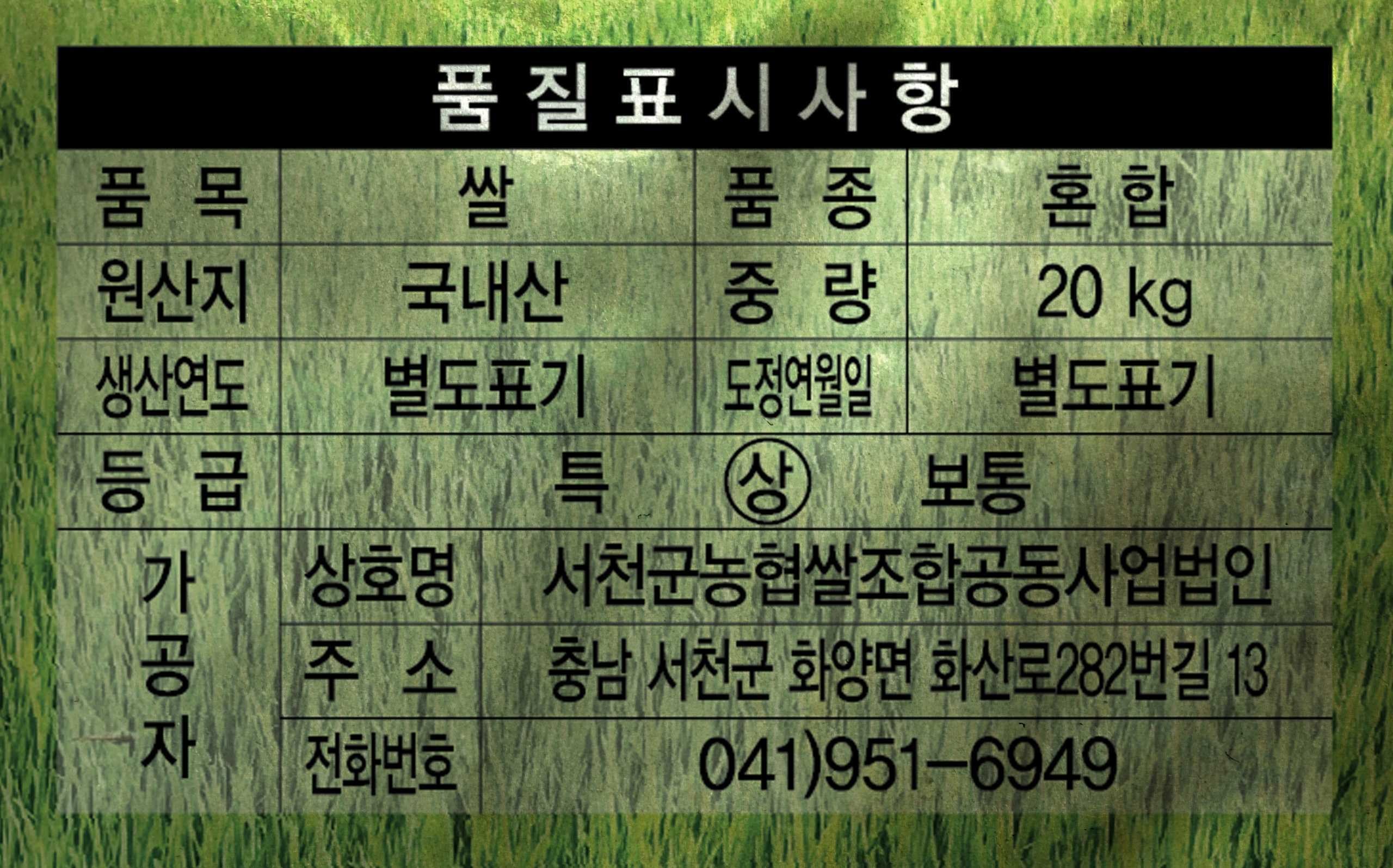 | 품목 또는 명칭 | 알찬쌀 백미 | 포장단위별 내용물의 용량(중량),수량,크기 | 20kg x 1개 |