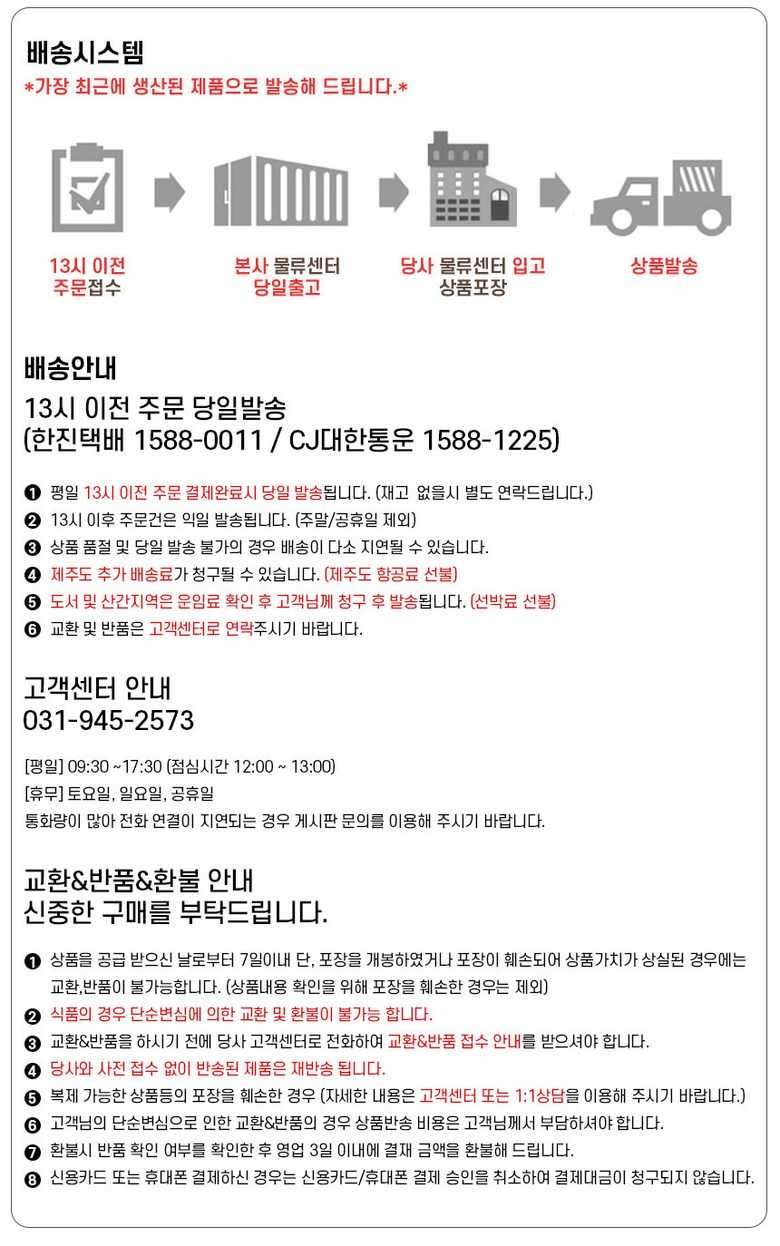 - ㆍ모니터 해상도의 차이로 인해 색상이나 이미지가 실제와 달라, 고객이 단순 변심으로 교환/반품을 무료로 요청하는 경우