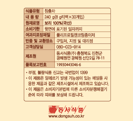 | 제품명 | 동서 엄마순보리차 | 식품의 유형 | 침출차 |