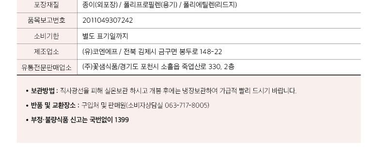 | 생산자 및 소재지 | 상품 상세페이지 참조 | 제조연월일, 소비기한 또는 품질유지기한 | 상품 상세페이지 참조 |