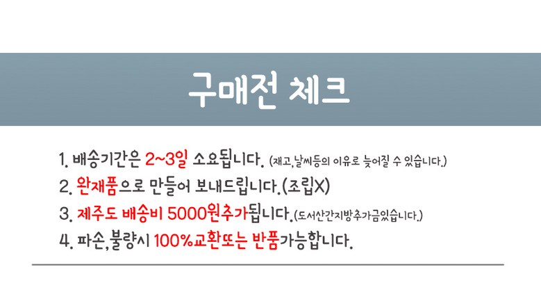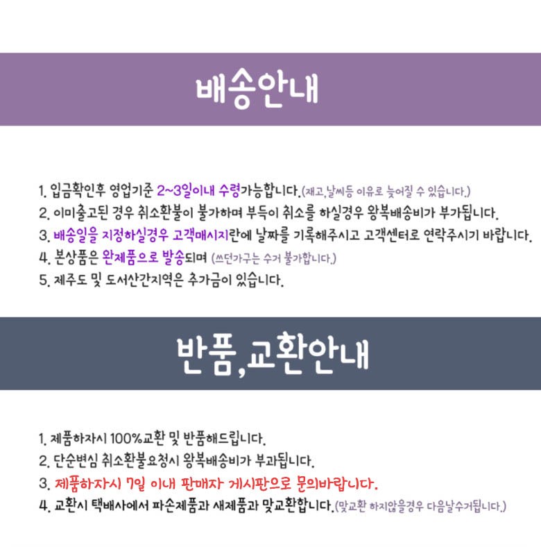 - ㆍ모니터 해상도의 차이로 인해 색상이나 이미지가 실제와 달라, 고객이 단순 변심으로 교환/반품을 무료로 요청하는 경우
