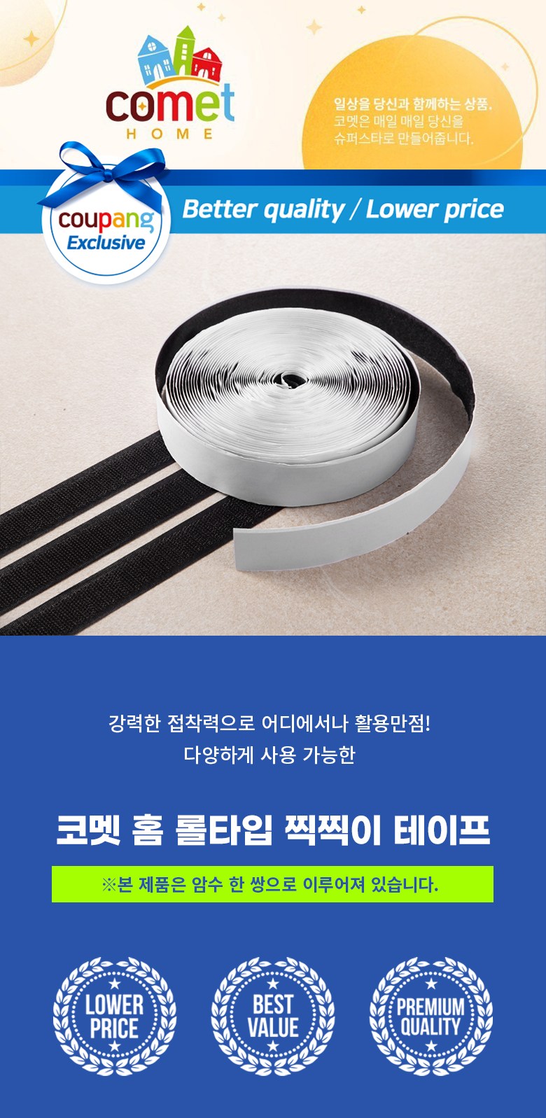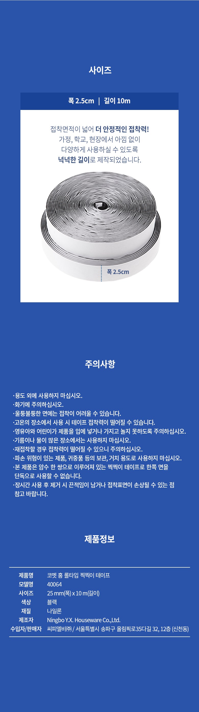 | 품명 및 모델명 | 코멧 홈 롤타입 찍찍이 테이프 25mm x 10m, 블랙 | 인증/허가 사항 | 해당없음 |