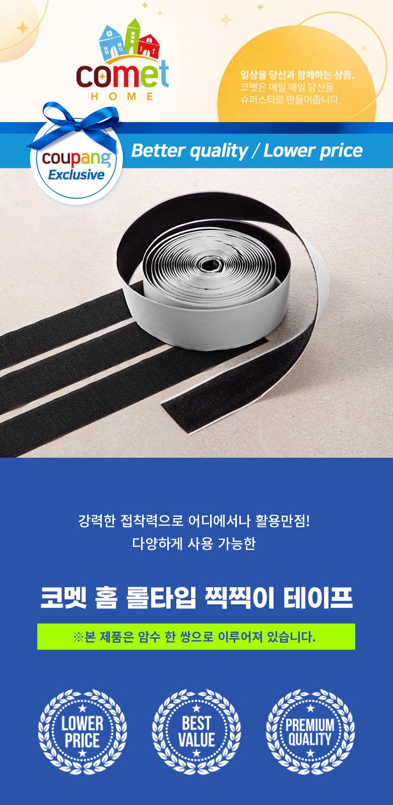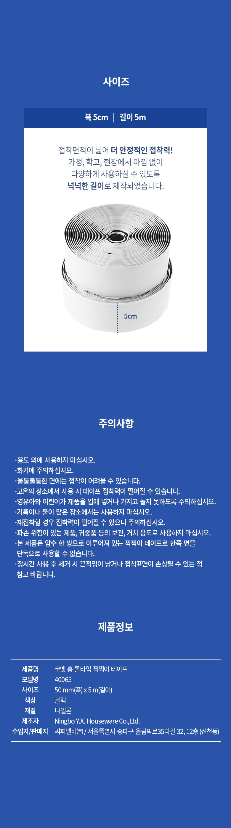 | 품명 및 모델명 | 코멧 홈 롤타입 찍찍이 테이프 50mm x 5m, 블랙 | 인증/허가 사항 | 해당없음 |