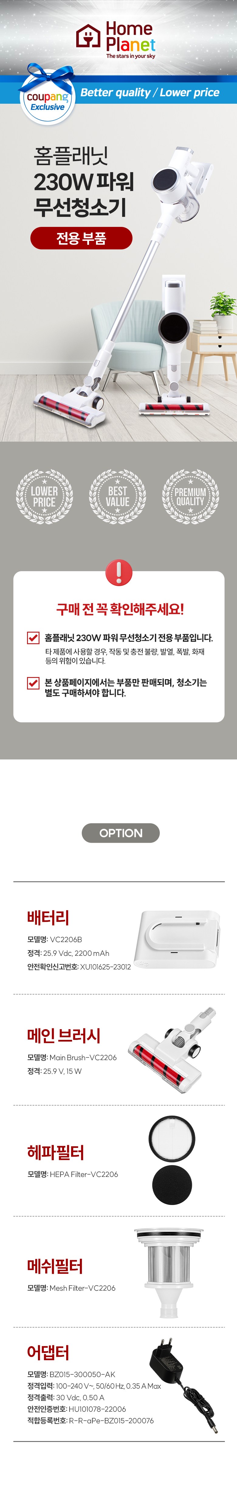 | 품명 및 모델명 | 홈플래닛 230W 파워 무선청소기 전용 배터리, VC2206B | KC 인증정보 | XU101625-23012 |