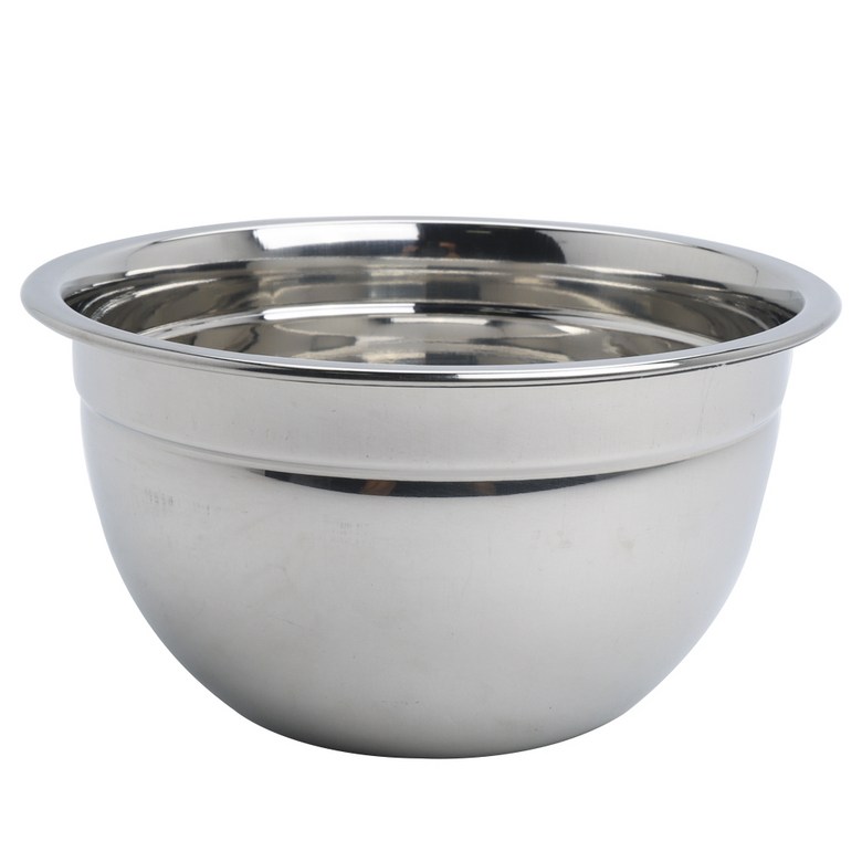 빛나는 스테인리스 스틸 재질의 믹싱볼입니다. 넓은 테두리가 있어 손으로 잡기 편리합니다. 다양한 재료들을 넣어 편하게 섞을 수 있습니다.