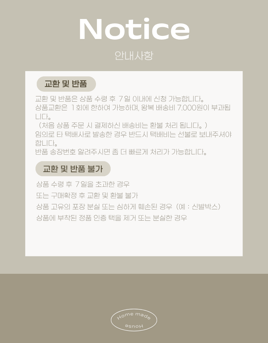 | 교환/반품 비용 (왕복비용) | 7,000원 - 단, 고객 변심의 경우에만 발생 - 도서산간 지역 배송불가 |