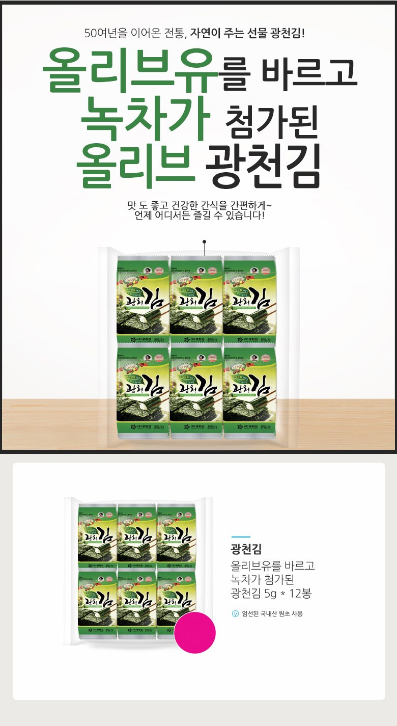 | 제품명 | 올리브유를 바르고 녹차가 첨가된 김 | 식품의 유형 | 조미김 |