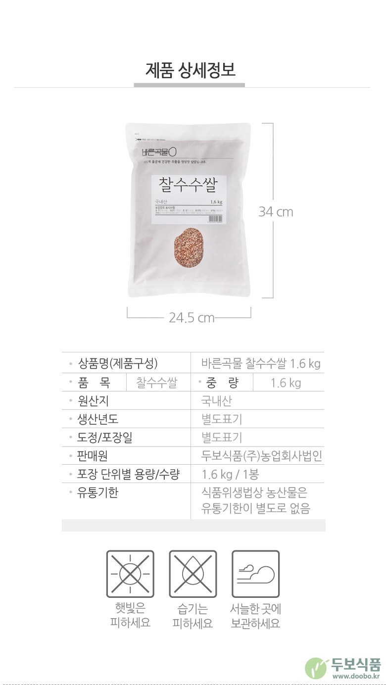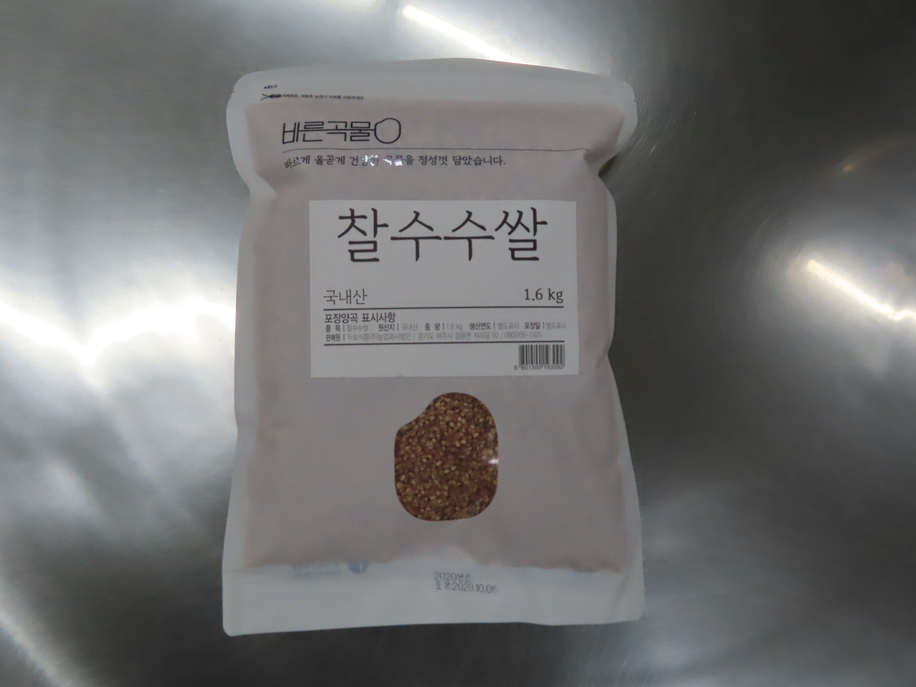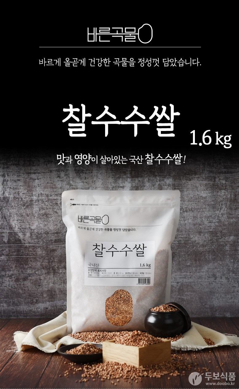 | 품목 또는 명칭 | 바른곡물 찰수수쌀 | 포장단위별 내용물의 용량(중량),수량,크기 | 1.6kg 1개 |