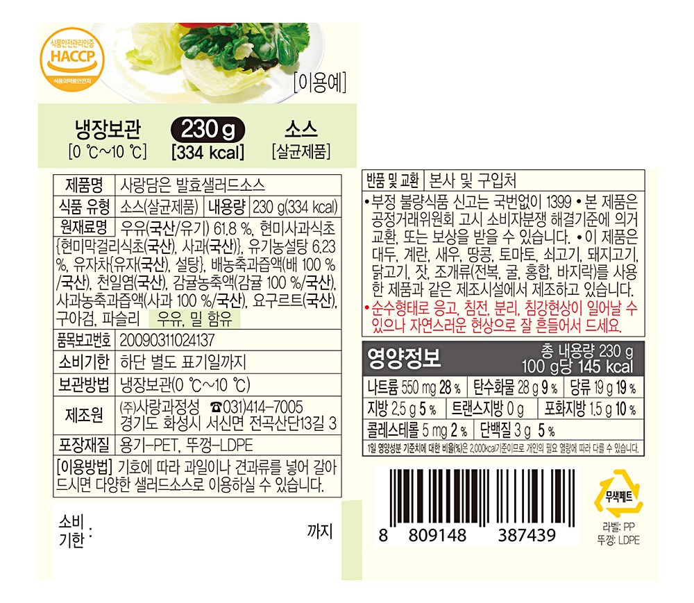 | 제품명 | 사랑담은 발효샐러드소스 | 식품의 유형 | 컨텐츠참조 |