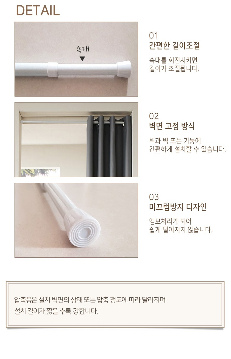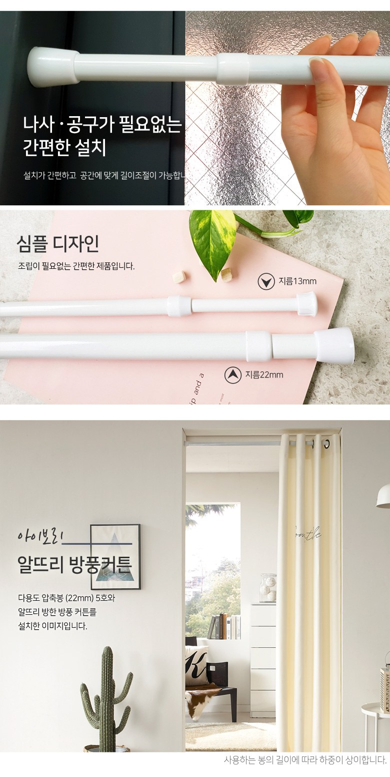 | 제품 소재 | 커튼:폴리에스테르100% 압축봉:몸체-스틸/손잡이-PVC | 색상 | 컨텐츠 참조 |