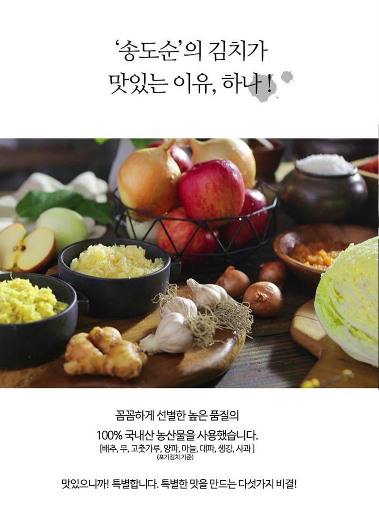 | 포장단위별 내용물의 용량(중량), 수량 | 10kg*1ea | 원재료명 및 함량 | ■포기김치:절임배추[배추98%(국산), 식염2%(국산)] 68%(국산), 무 10.1%(국산), 찹쌀풀[찹쌀가루1:정제수5 비율]4.2%(국산), 고춧가루4.2%(국산), 염장새우[새우젓](국산), 물엿, 양파(국산), 사과(국산), 마늘(국산), 액젓[멸치액젓](국산), 대파(국산), 생강(국산) |