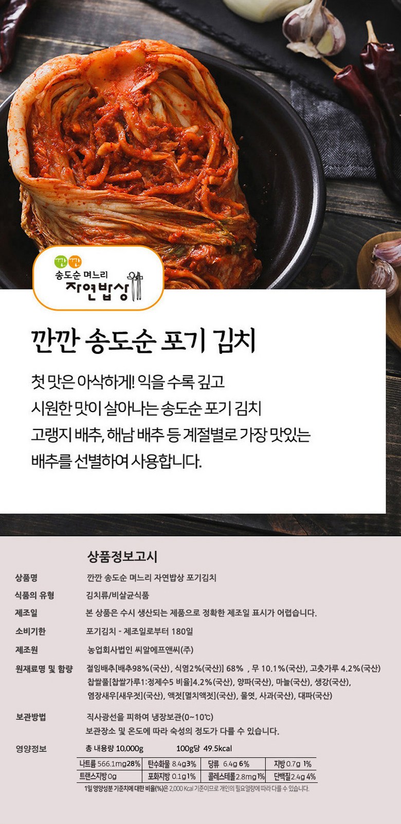 | 제품명 | 깐깐 송도순 포기김치 10kg | 식품의 유형 | 포기김치(비살균제품) |