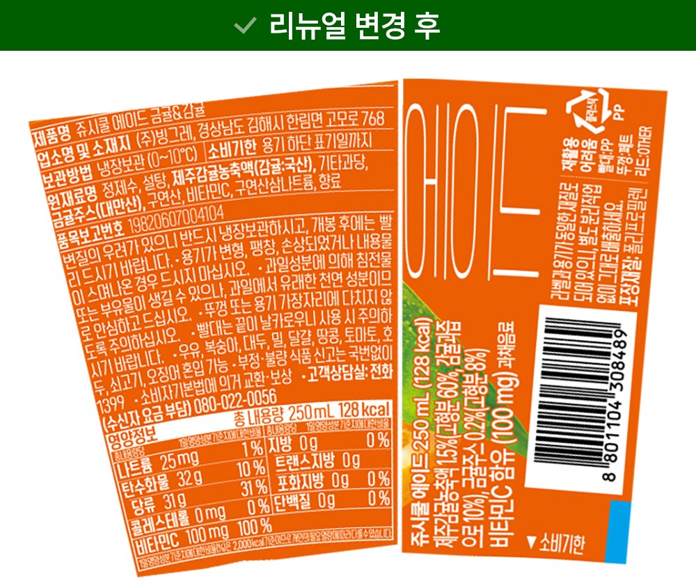 | 포장단위별 내용물의 용량(중량), 수량 | 250ml x 10개 | 원재료명 및 함량 | 컨텐츠 참조 |