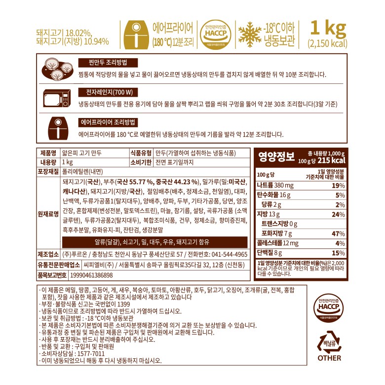 | 포장단위별 내용물의 용량(중량), 수량 | 1kg, 1개 | 원재료명 및 함량 | 컨텐츠 참조 |