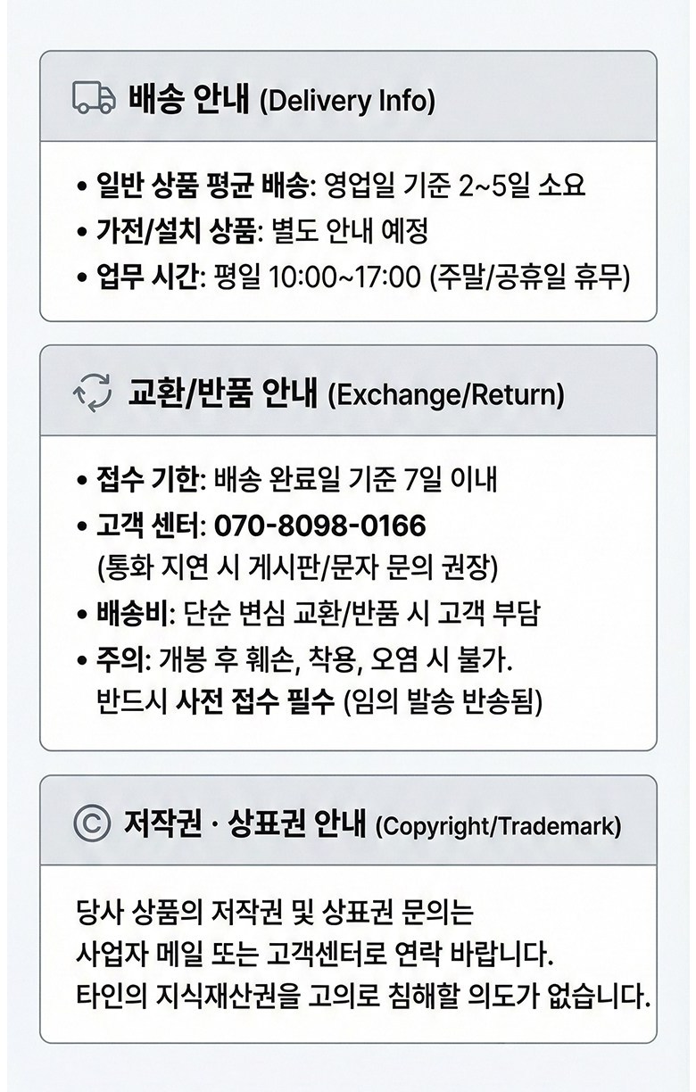 - ㆍ교환/반품에 관한 일반적인 사항은 판매자가 제시사항보다 관계법령이 우선합니다.