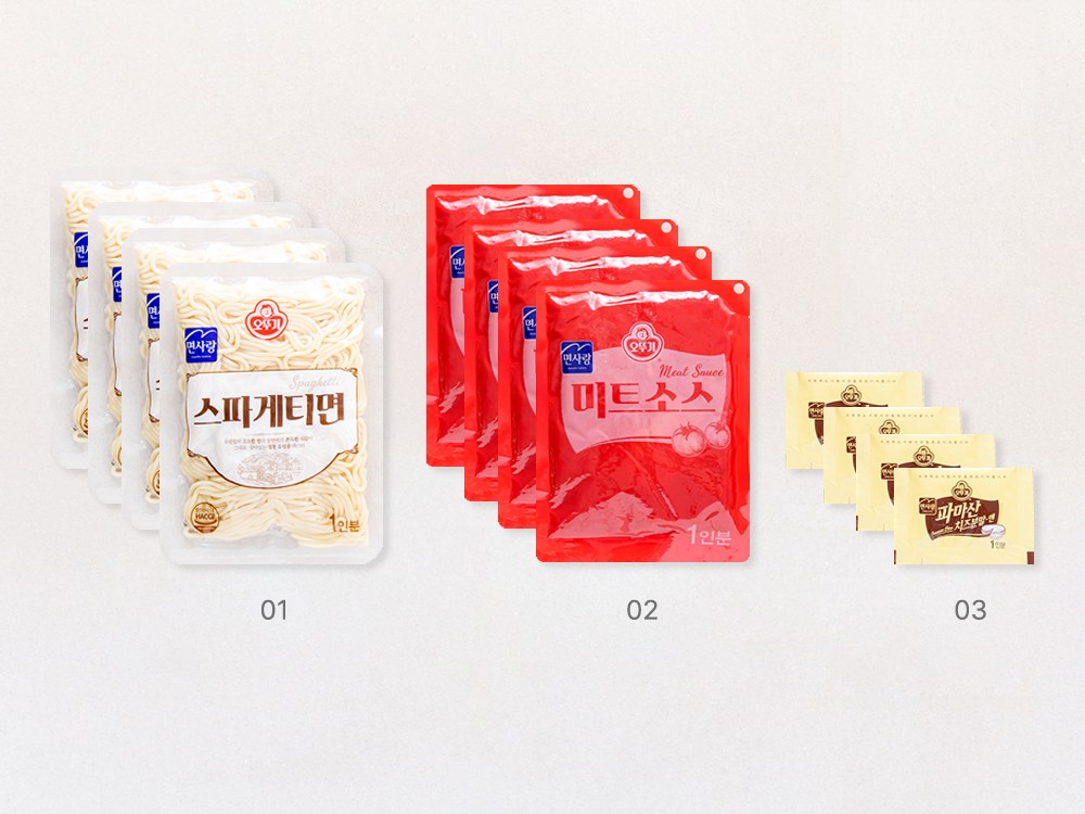 끓는 물에 스파게티 면을 넣고 90초 동안 끓이고 물기를 빼주세요. 미트소스는 별도의 끓는 물에 3분간 데운 후 삶은 면, 파마산 치즈와 함께 섞어주세요.