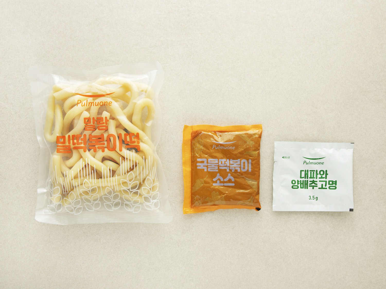 밀떡볶이떡, 국물떡볶이소스, 대파와 양배추 고명으로 구성되어 있습니다.