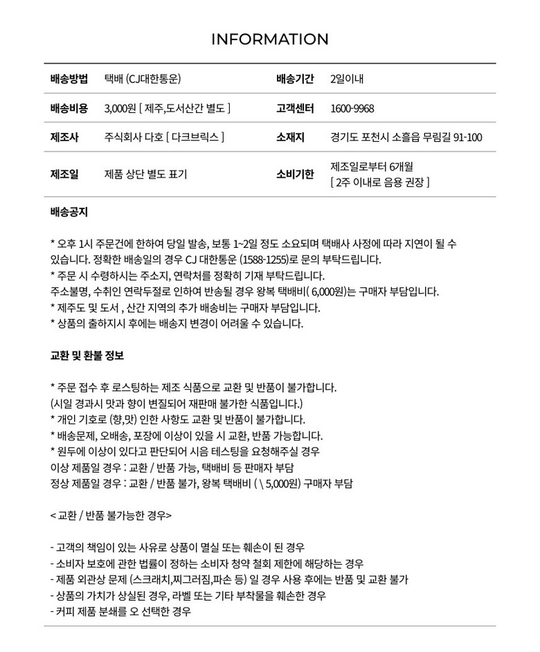 | 생산자 및 소재지 | 상품 상세페이지 참조 | 제조연월일, 소비기한 또는 품질유지기한 | 상품 상세페이지 참조 |