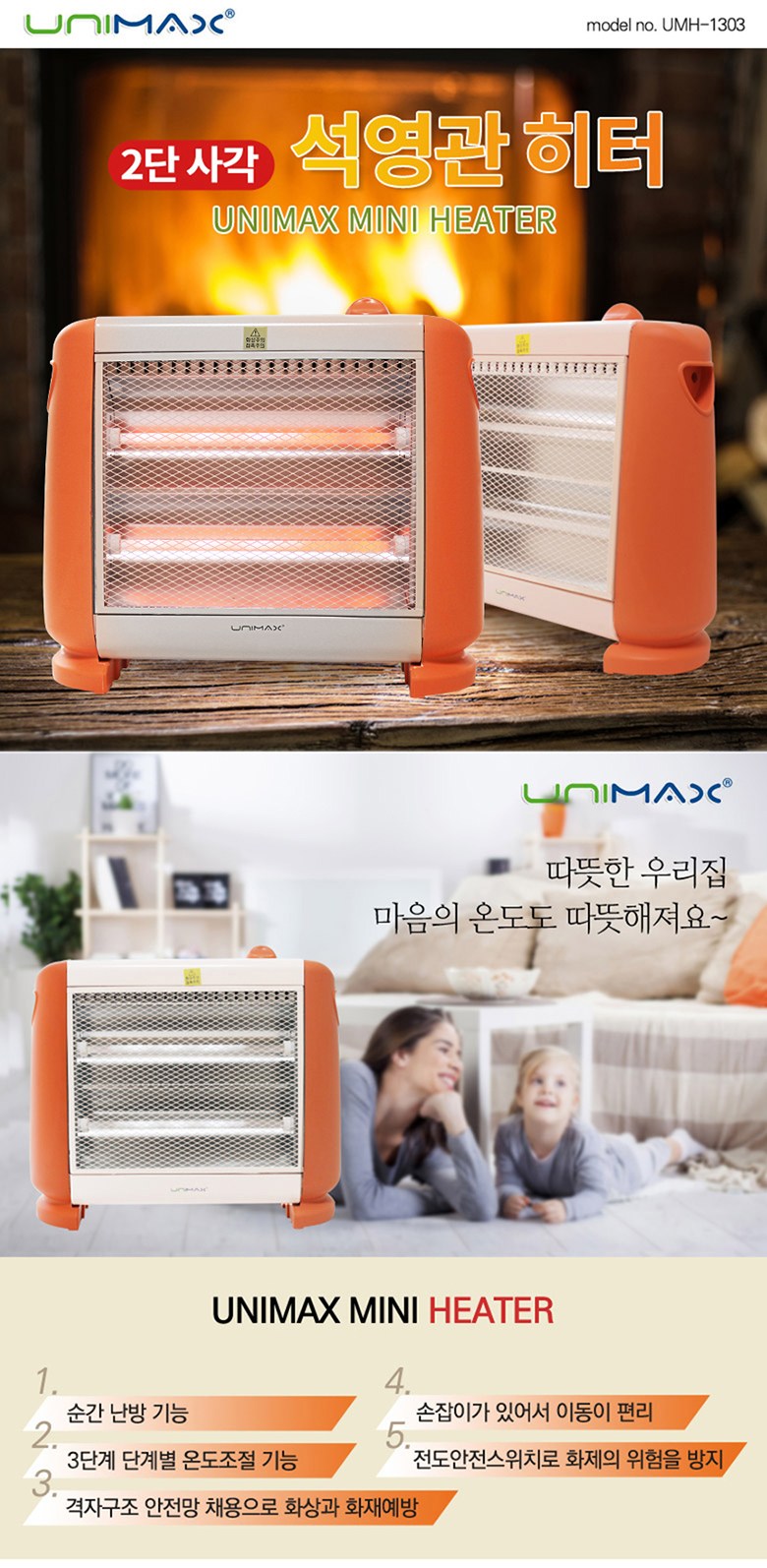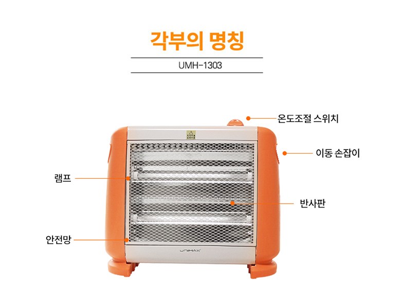 | 품명 및 모델명 | 전기난로 UMH-1303 | KC 인증정보 | 유 / HU071502-13002E , MSIP-REM-GX1-DES-902 |