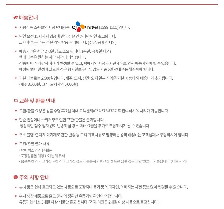 | 교환/반품 비용 (왕복비용) | 6,000원 - 단, 고객 변심의 경우에만 발생 - 도서산간 지역 배송불가 |