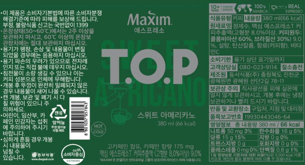| 포장단위별 내용물의 용량(중량), 수량 | 380ml × 24개 x 1개, 1개 | 원재료명 및 함량 | 컨텐츠 참조 |