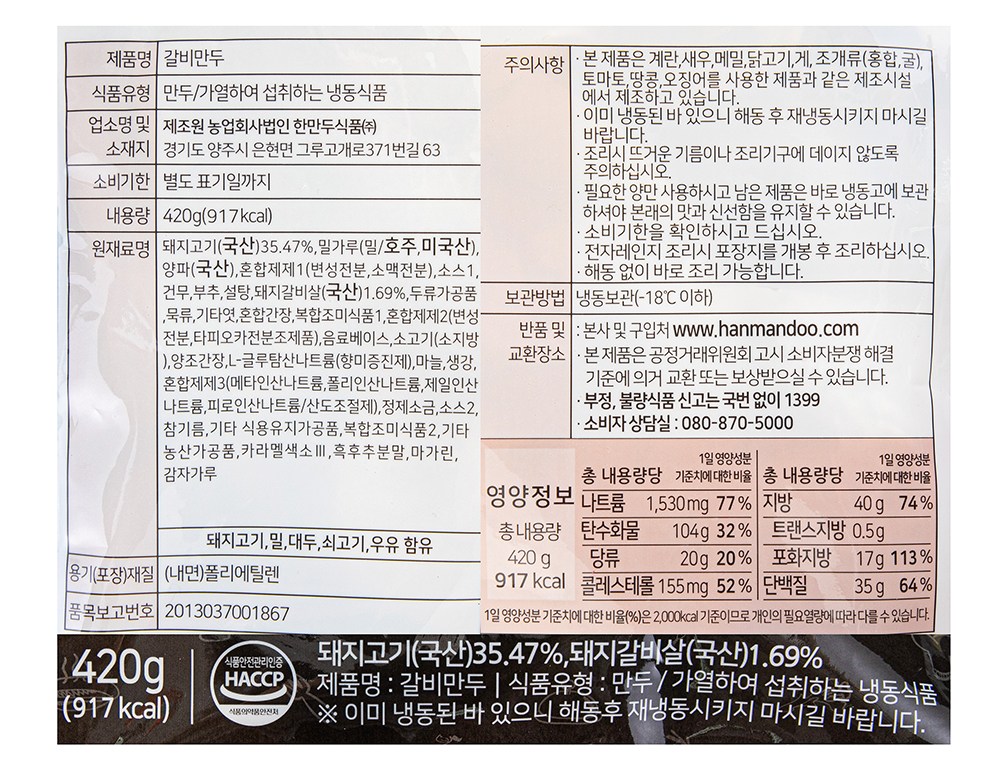 | 제품명 | 갈비만두 | 식품의 유형 | 컨텐츠 참조 |