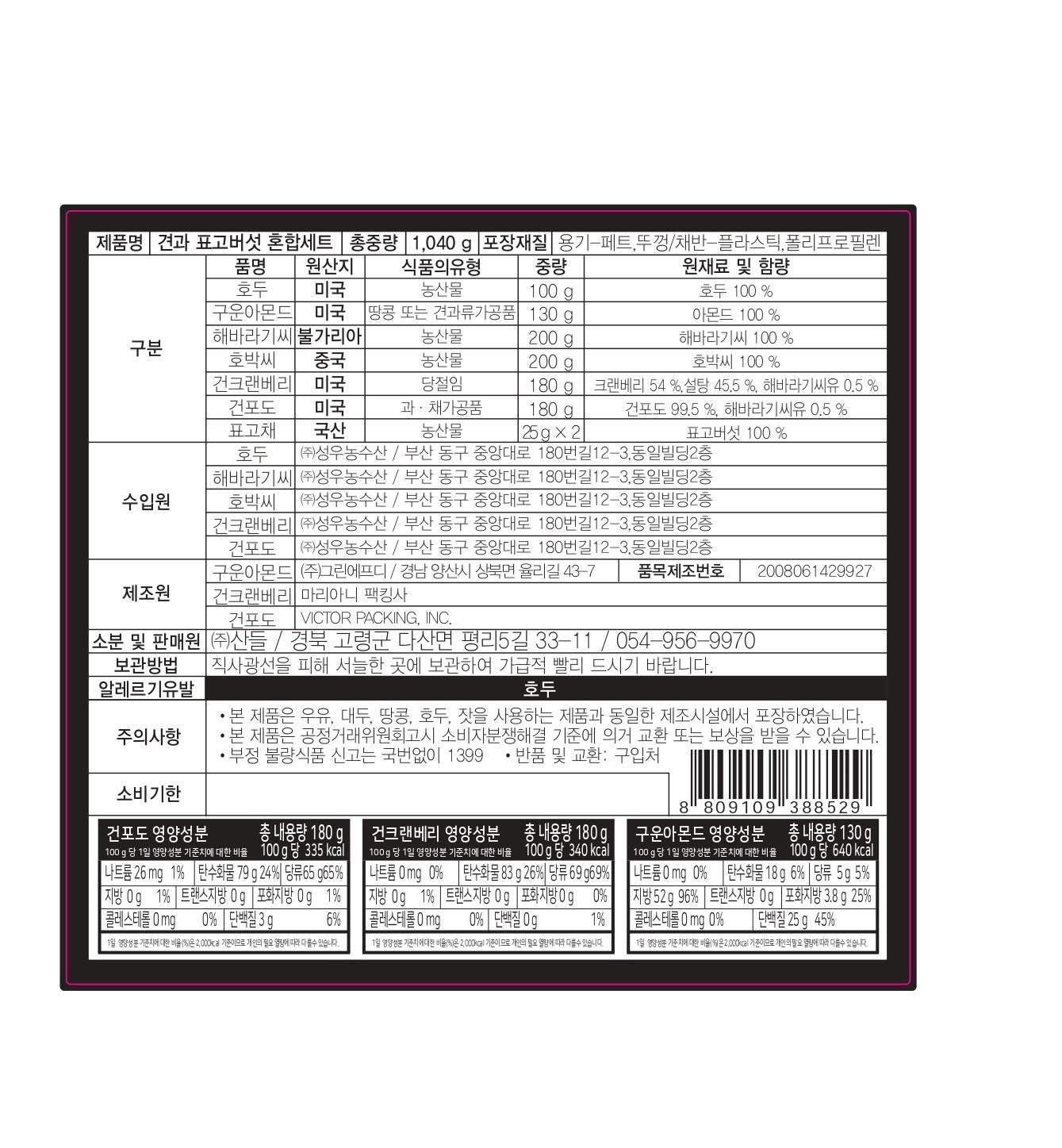 | 제조연월일, 소비기한 또는 품질유지기한 | 소비기한(또는 유통기한) : 2026년 04월 13일 이거나 그 이후인 상품<br />제조년월일 : 2025년 10월 16일 이후인 제조상품 | 세부 품목군별 표시사항 | [호두, 해바라기씨, 호박씨, 표고채] 농수산물 : 유전자변형(해당 없음) / 지리적 표시사항(해당 없음) / [그 외] : 해당없음 |
