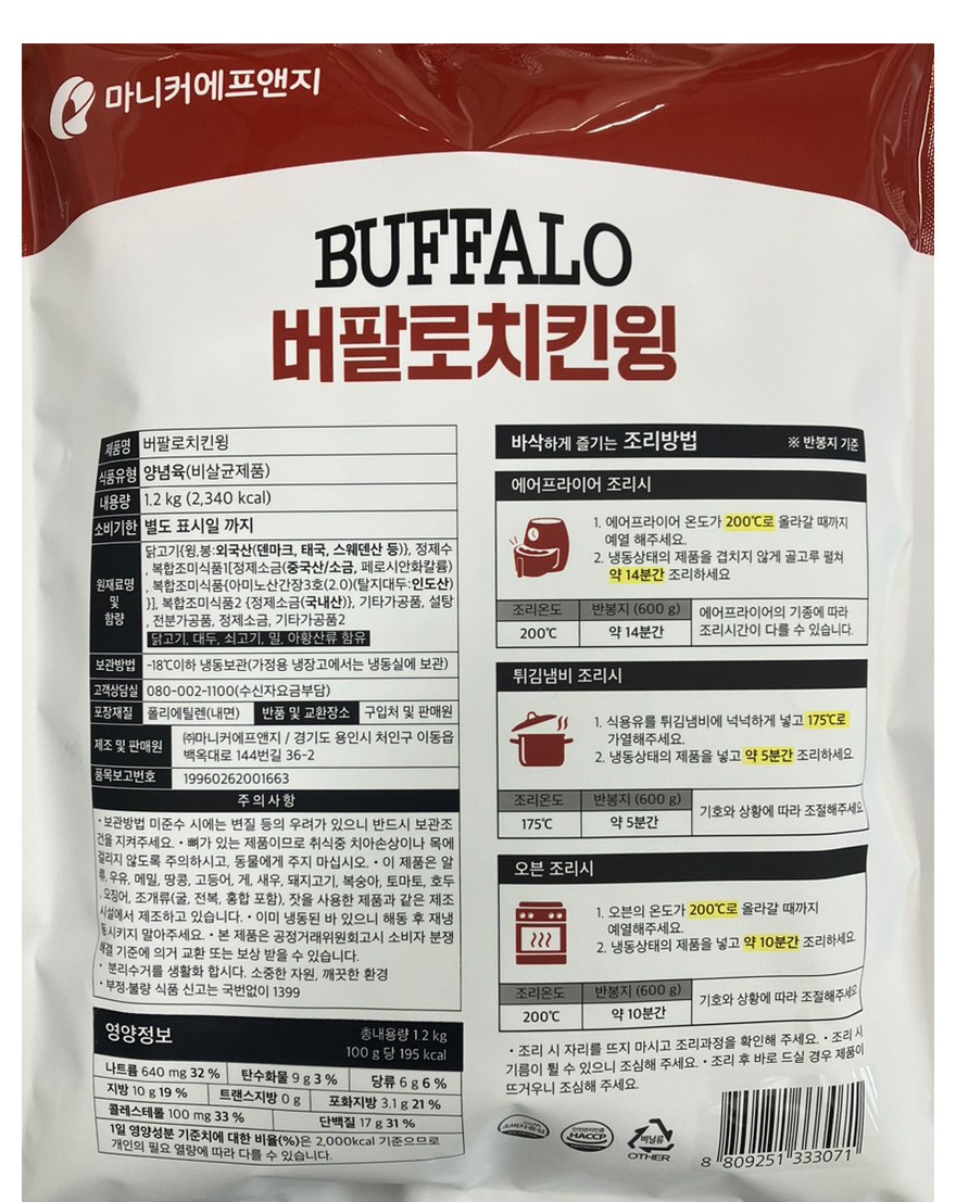 | 제품명 | 버팔로치킨윙 | 식품의 유형 | 컨텐츠참조 |