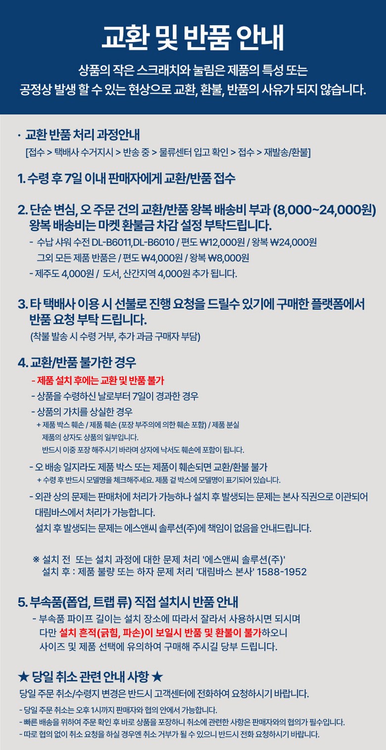 - ㆍ교환/반품에 관한 일반적인 사항은 판매자가 제시사항보다 관계법령이 우선합니다.