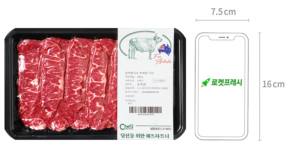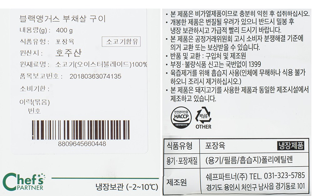 | 품목 또는 명칭 | 블랙앵거스 부채살 구이 | 포장단위별 내용물의 용량(중량),수량,크기 | 400g x 4개 |