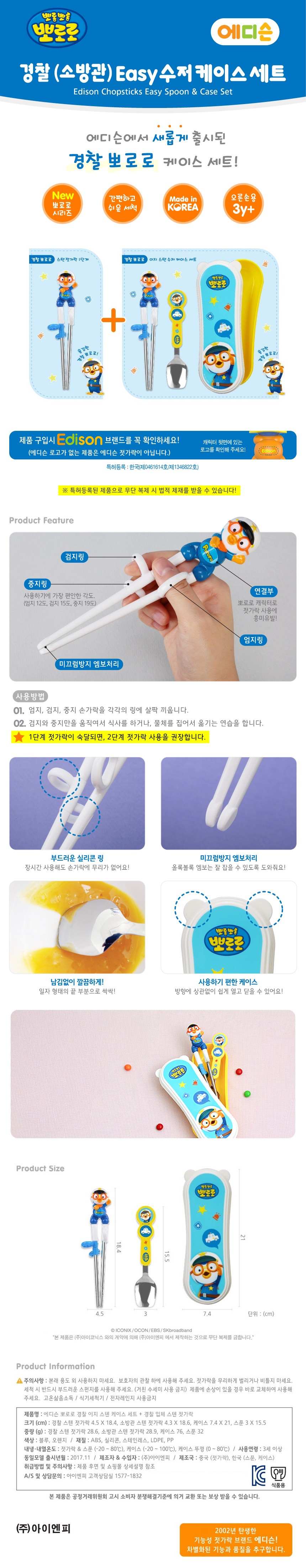 | 품명 및 모델명 | 에디슨 경찰 뽀로로 이지 스텐 수저 케이스 세트 + 경찰 입체 스텐 젓가락 (오른손용) | 재질 | 컨텐츠 참조 |