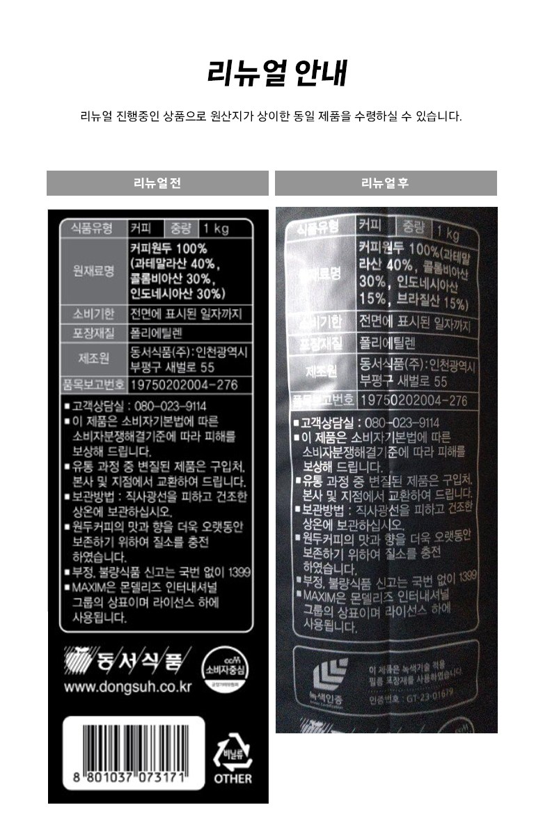 | 제품명 | 맥심 시그니처 블렌드 풀 어센틱 | 식품의 유형 | 커피 |