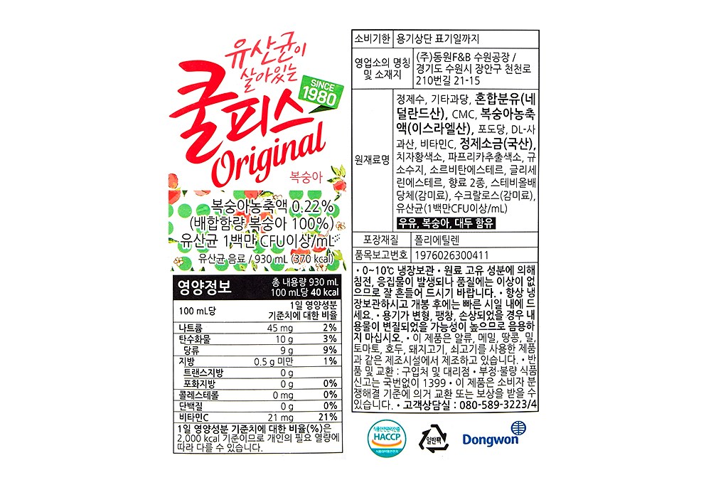 | 제품명 | 쿨피스 복숭아 | 식품의 유형 | 컨텐츠 참조 |