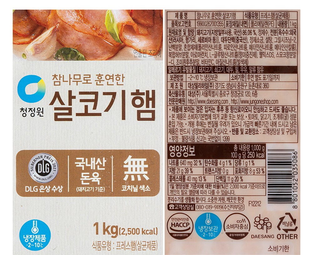 | 제품명 | 참나무로 훈연한 살코기햄 | 식품의 유형 | 프레스햄(살균제품) |