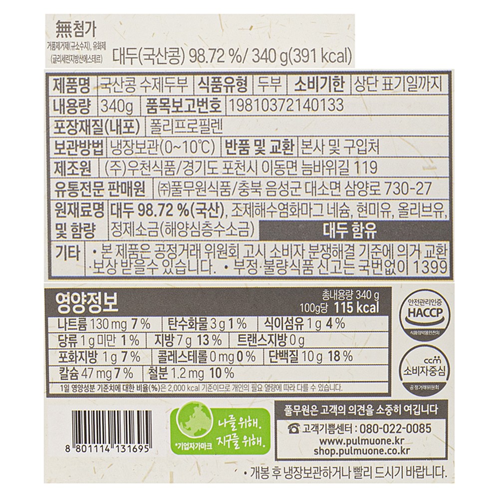 | 제품명 | 국산콩 수제두부 | 식품의 유형 | 컨텐츠참조 |