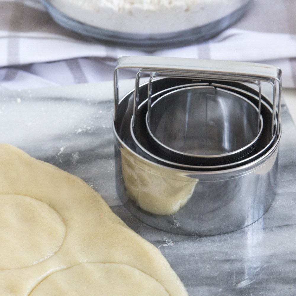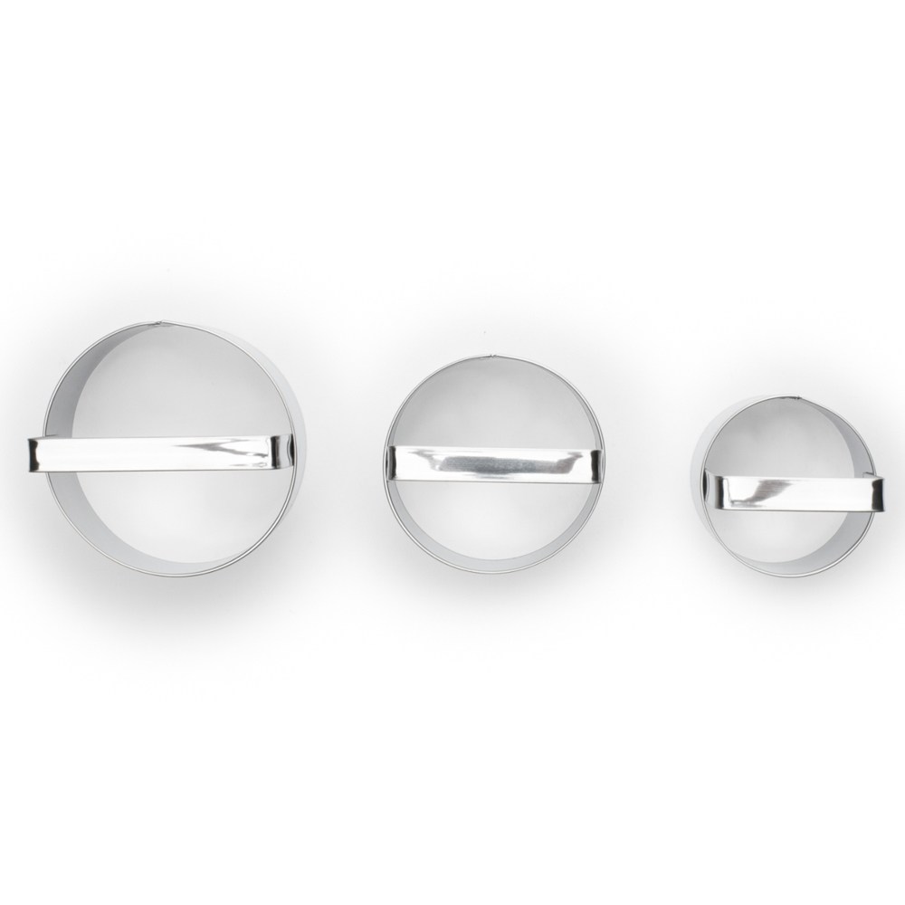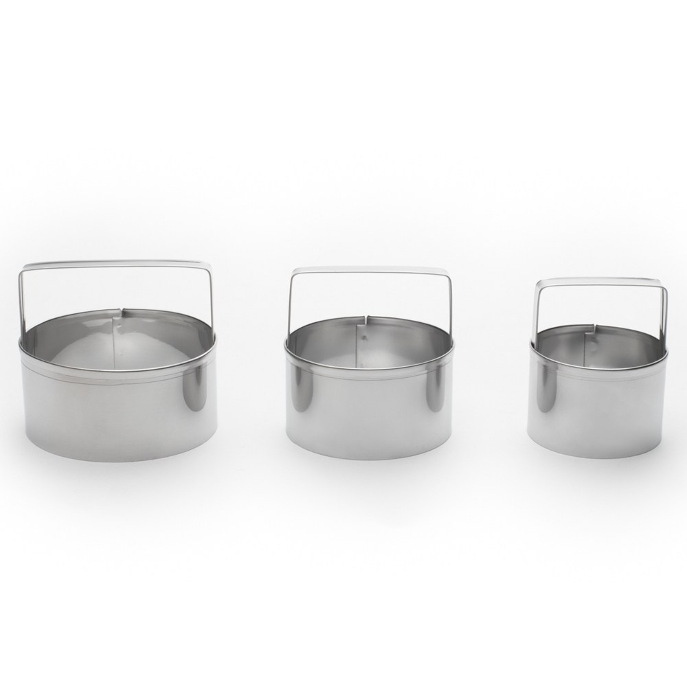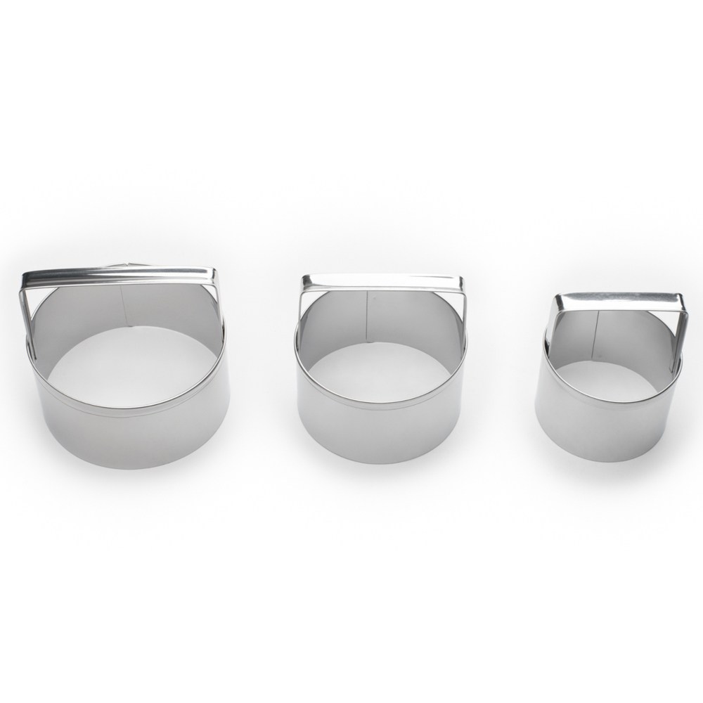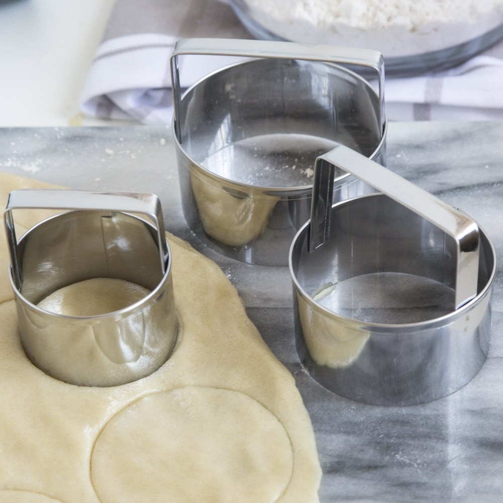튼튼한 스테인리스 스틸 재질의 비스킷 커터 3종 세트입니다. 스콘, 페이스트리, 비스킷 등을 만들 때 사용하기 좋습니다. 손잡이가 있어 빠르고 간편하게 사용할 수 있습니다. 사이즈 5.1cm, 6.4cm, 7.6cm입니다.