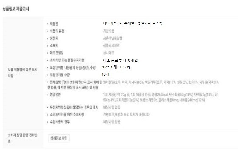 | 제조연월일, 소비기한 또는 품질유지기한 | 상품 상세페이지 참조 | 세부 품목군별 표시사항 | 상품 상세페이지 참조 |