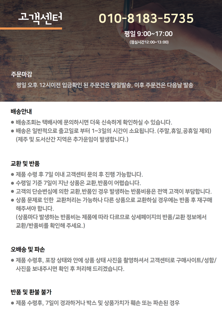 - ㆍ모니터 해상도의 차이로 인해 색상이나 이미지가 실제와 달라, 고객이 단순 변심으로 교환/반품을 무료로 요청하는 경우