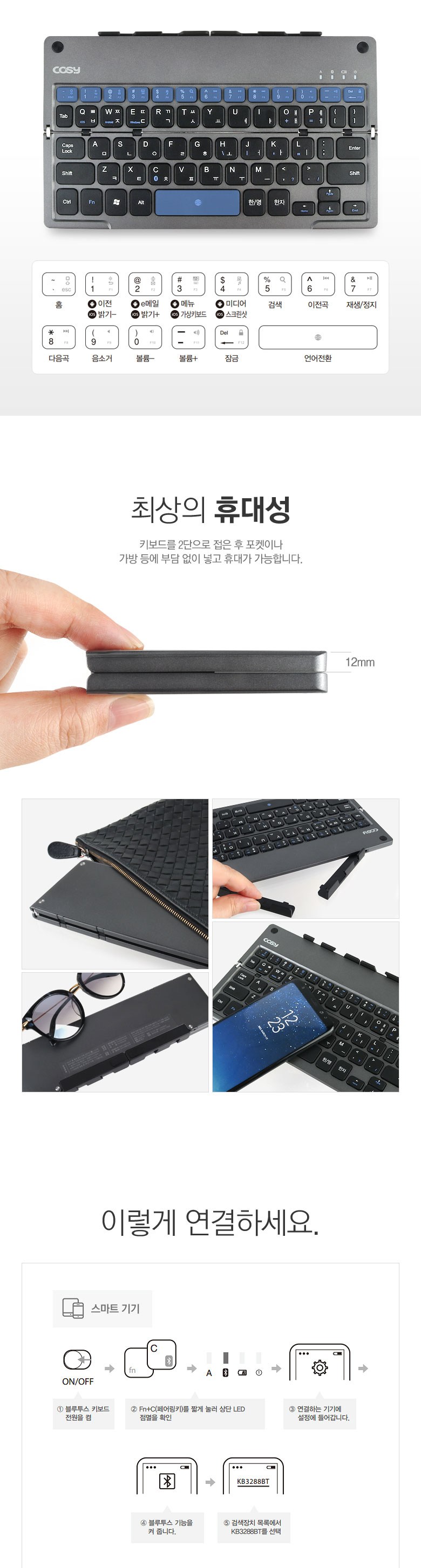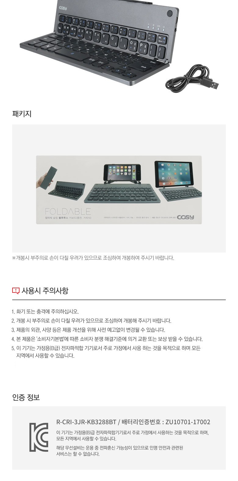 | 품명 및 모델명 | 접이식 슬림 블루투스 키보드(충전,거치식)/ KB3288BT | KC 인증정보 | R-CRI-3JR-KB3288BT |