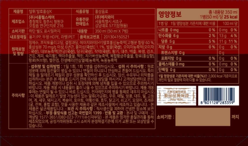 | 포장단위별 내용물의 용량(중량), 수량 | 50ml x 28개 | 원재료명 및 함량 | 컨텐츠 참조 |