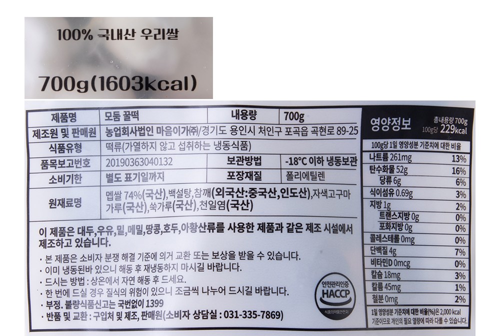 | 제품명 | 마음이가 모둠 꿀떡 | 식품의 유형 | 떡류(가열하지 않고 섭취하는 냉동식품) |
