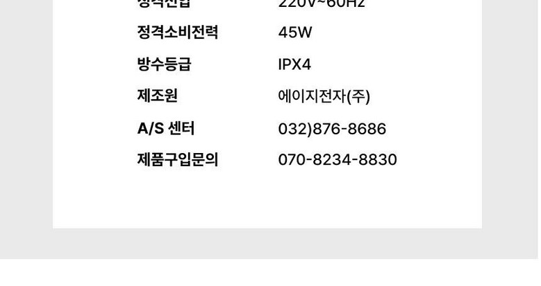 | 제조국(원산지) | 국산 | 제조자(수입자) | 에이지전자 (주) |