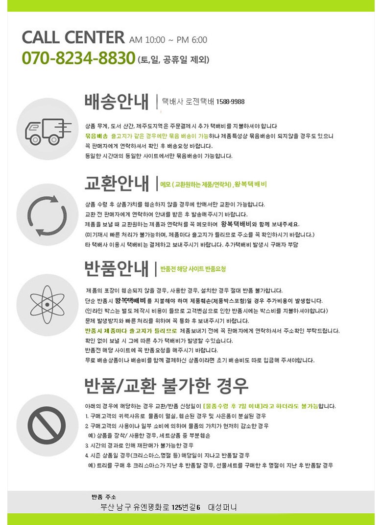- ㆍ모니터 해상도의 차이로 인해 색상이나 이미지가 실제와 달라, 고객이 단순 변심으로 교환/반품을 무료로 요청하는 경우