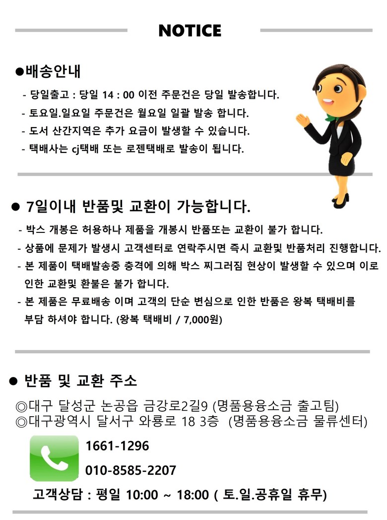 - ㆍ모니터 해상도의 차이로 인해 색상이나 이미지가 실제와 달라, 고객이 단순 변심으로 교환/반품을 무료로 요청하는 경우